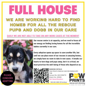 Creating opportunities for a better tomorrow for the dogs and puppies in our care, we have made the very difficult decision to accept no more dogs at this stage. We need to focus on the wellbeing, health and homing of the many dogs we already have, before we can truly say we have helped, rather than been part of the problem. We are working closely with a behaviorist this year, to keep our dogs trained, stimulated and flourishing. We are in conversation with the SPCA, various businesses and our dear friends, to ensure Paw PrintsRescue and Rehoming will no longer be a victim of circumstance, but become a champion for those dogs and puppies in need.